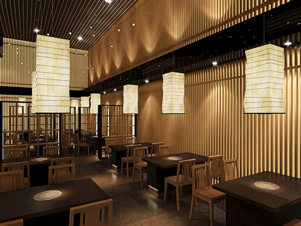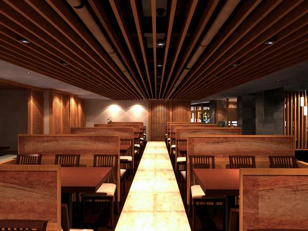 中国青岛的大型日本料理店设计。店铺整体被格子所包围,有一种日本的纤细感弥漫在店铺内弥漫。由于店中心有一天窗,所以将此天窗作为本次内装设计的格调。